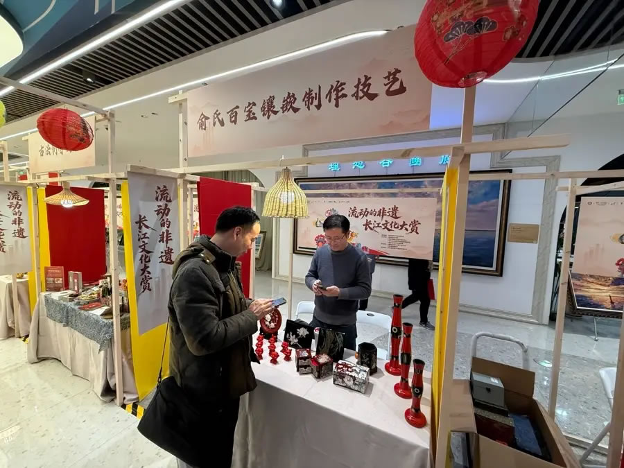 掛上紅燈籠,擺上精致的剪紙、竹編、漆器,一個(gè)熱鬧的非遺市集開張了。作為“上海新年第一游”寶山主會(huì)場活動(dòng)的組成部分,昨天,“流動(dòng)的非遺·長江文化大賞”率先在寶山濱江的上海·海上世界商圈拉開序幕。