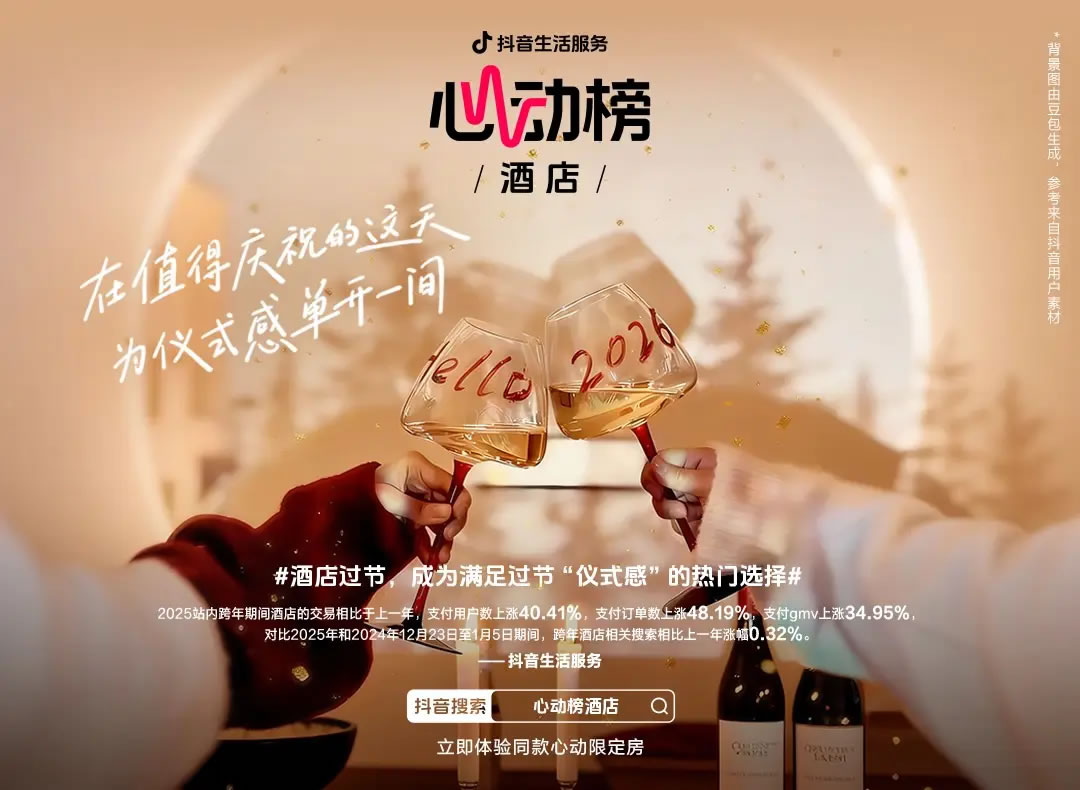 在這場(chǎng)全民性?xún)x式感浪潮中,抖音生活服務(wù)推出的「心動(dòng)榜酒店」之跨年航班和紅人派對(duì),精準(zhǔn)切入并引爆了市場(chǎng)熱度,數(shù)據(jù)顯示,圍繞此類(lèi)活動(dòng)的內(nèi)容播放量和參與度屢創(chuàng)新高。酒旅行業(yè)的競(jìng)爭(zhēng)邏輯,正在從傳統(tǒng)的“目的地與價(jià)格”之爭(zhēng),全面升級(jí)為 “場(chǎng)景營(yíng)造與情緒共鳴”, 抖音正試圖重塑高端酒店的消費(fèi)體驗(yàn),并重新定義節(jié)假旅行的消費(fèi)決策路徑。