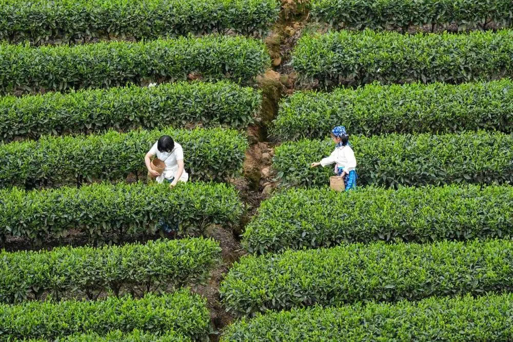 4月5日,人們在四川省雅安市牛碾坪萬畝觀光茶園體驗采茶。新華社記者胥冰潔 攝