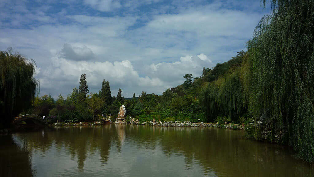白邑黑龍?zhí),位于嵩明縣白邑鄉(xiāng)龍?zhí)稜I(yíng)村南,旁修黑龍?zhí)端隆J冀ㄓ诿鞔。存正殿三間,南北廂房各五間,南北配殿各三間,戲臺(tái)一座,財(cái)神廟一座。正殿前有一塊光緒皇帝題寫(xiě)的匾額,上書(shū)“盤(pán)江昭佑”四個(gè)大字,右題:“欽命太子太保兵部尚書(shū)云貴總督部堂白山伊里布吉旦”,左邊落款是“大清光緒十三年季春月下浣日吉旦”,中有一璽印:“光緒御筆之寶”。白邑黑龍?zhí)度劬驮趶R中的龍?zhí)丁L斗帜媳眱商,北潭泉盛,注入南潭,潭底望去,呈青黑色,故名黑龍(zhí)。水從潭中涌出,形成小河,向南注入松花壩水?kù)。