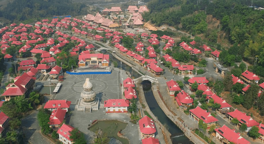 葫蘆小鎮(zhèn)位于滄源縣城西南3千米處,于2013年建設(shè)完工,小鎮(zhèn)占地面積202畝,共有民居180戶,建筑風(fēng)格保留佤族民居獨(dú)有的建筑特點(diǎn),外形特征為紅色弧形屋頂及屋角裝飾交叉角。小鎮(zhèn)180棟紅色弧形屋頂特色民居與文化墻、噴水葫蘆、打歌廣場(chǎng)、寨心磚、葫蘆塔、佤王府等佤族特色建筑巧妙地融合在一起。