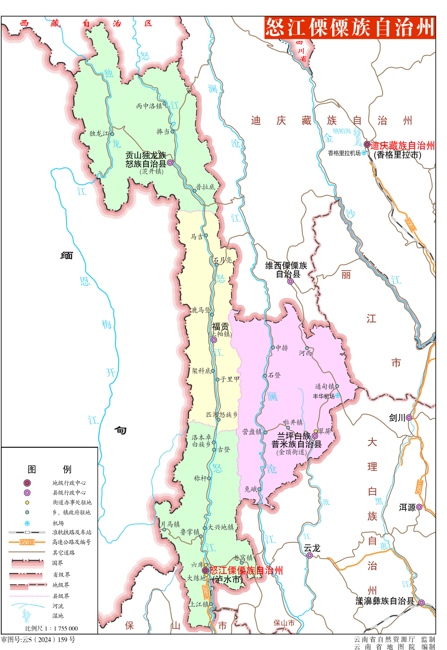 怒江傈僳族自治州轄1個(gè)縣級(jí)市、1個(gè)縣、2個(gè)自治縣: