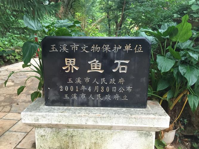 界魚石界魚石屬碳酸鹽巖石礫塊,石塊壁面上有經(jīng)地質(zhì)時(shí)期溶蝕形成的溶孔。界魚石背靠野牛山,面臨連通星云湖撫仙湖的玉帶河。石塊所在的北岸山坡林木茂密。玉帶河寬70m,水深3-4m,長約2.1km,在界魚石上題刻有“界魚石”,及清江川縣令李密題書“石怪鱗驚”,鐵嶺竺文人兆鵬題書“魚各有性”。