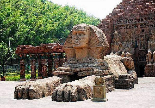 漫漫黃沙中,那宏偉的建筑,依稀就是魂?duì)繅?mèng)繞已久的胡夫大金字塔和守護(hù)它數(shù)千年的獅身人面像;燥熱暖風(fēng)里,法老們古老的咒語(yǔ),斷斷續(xù)續(xù)飄來,召喚著我們不由自主的向前,渴望一探究竟。坐上埃及的太陽(yáng)船,穿過金字塔黑暗的甬道,危險(xiǎn)的鬼屋,劈波斬浪的剎那,才發(fā)現(xiàn)早已沉醉在古埃及異度時(shí)空的迷夢(mèng)中。