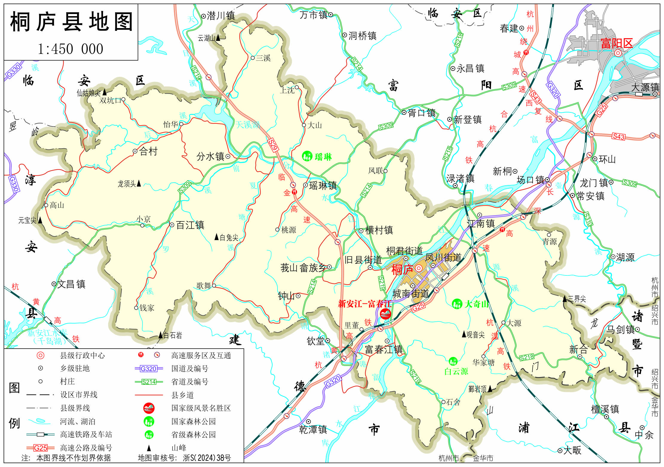 以縣城桐君街道為中心,東20公里(徑距,下同)至牛峰嶺界富陽(yáng),南19公里至羊嶠頂界建德,西39公里至太陽(yáng)山界淳安,北13公里至陳家山界富陽(yáng);東南27公里至火燒灣頂界浦江,西南12公里至大巖山界建德,東北16公里至橫山埠界富陽(yáng),西北41公里至高塘界臨安。