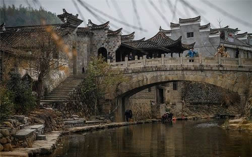 小橋如虹霓跨溪,上面長滿了綠藤,橋下水聲依依,站在不遠處的水埠上,半圓的橋拱與水中的倒影正好構成了一個圓,水波蕩漾,恍如一輪圓月,此景被叫做“楓溪望月”確是名不虛傳。
