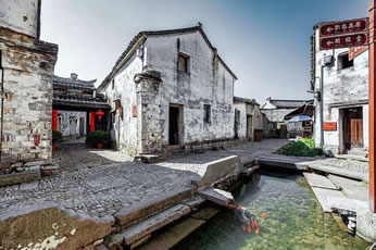 老街兩旁都是長板門面的店鋪。緊鄰老街是一幢幢至今保存完整的古建筑群,梁枋門窗上滿是雕飾,精巧的躍魚馬頭墻和脊塑墻花具有獨特的地方風(fēng)格。馬頭墻是古代江南富戶官宅威勢的象征,據(jù)說級數(shù)越多,職位越高。墻面嵌著雕花石窗,外墻上塑浮雕文字,墻尖塑著沖天而起的躍魚和飛龍,寓含“鯉魚跳龍門”之意。門柱上那兩只活動的倒掛獅子,門墻上一對瓷盆中各飾有5只飛舞的蝙蝠,象征著五福臨門。大祠堂建于明洪武十八年。大廳有32根大圓柱,好比32顆象棋子,隱含全局一盤棋之意;每根柱子中間大,兩頭小,是典型的隋唐風(fēng)格明式建筑。