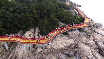 松蘭山游步道位于松蘭山沿海岸線,南起東沙灘,北至白沙灣,以棧道形式沿濱海礁石海灘穿行,全長3.1公里,平均寬度為2.5米,總面積約12萬平方米。棧道是集公眾性、休閑性、生態(tài)性為一體的高品質濱海慢行步道,沿線設置濱海眺臺、觀景平臺等,全程以紅色為主調,素有“海上紅絲帶”之美譽。