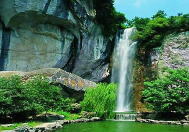 雙龍出海第二洩:二洩緊接一洩,落差為7.1米。瀑布下落時(shí),被一塊兀石分成兩半,分流如珠簾飄動(dòng),開朗而又深沉,又如雙龍出游不知天高地厚,古人有詩贊其曰:兩龍爭壑不知應(yīng),一石橫空不渡人。