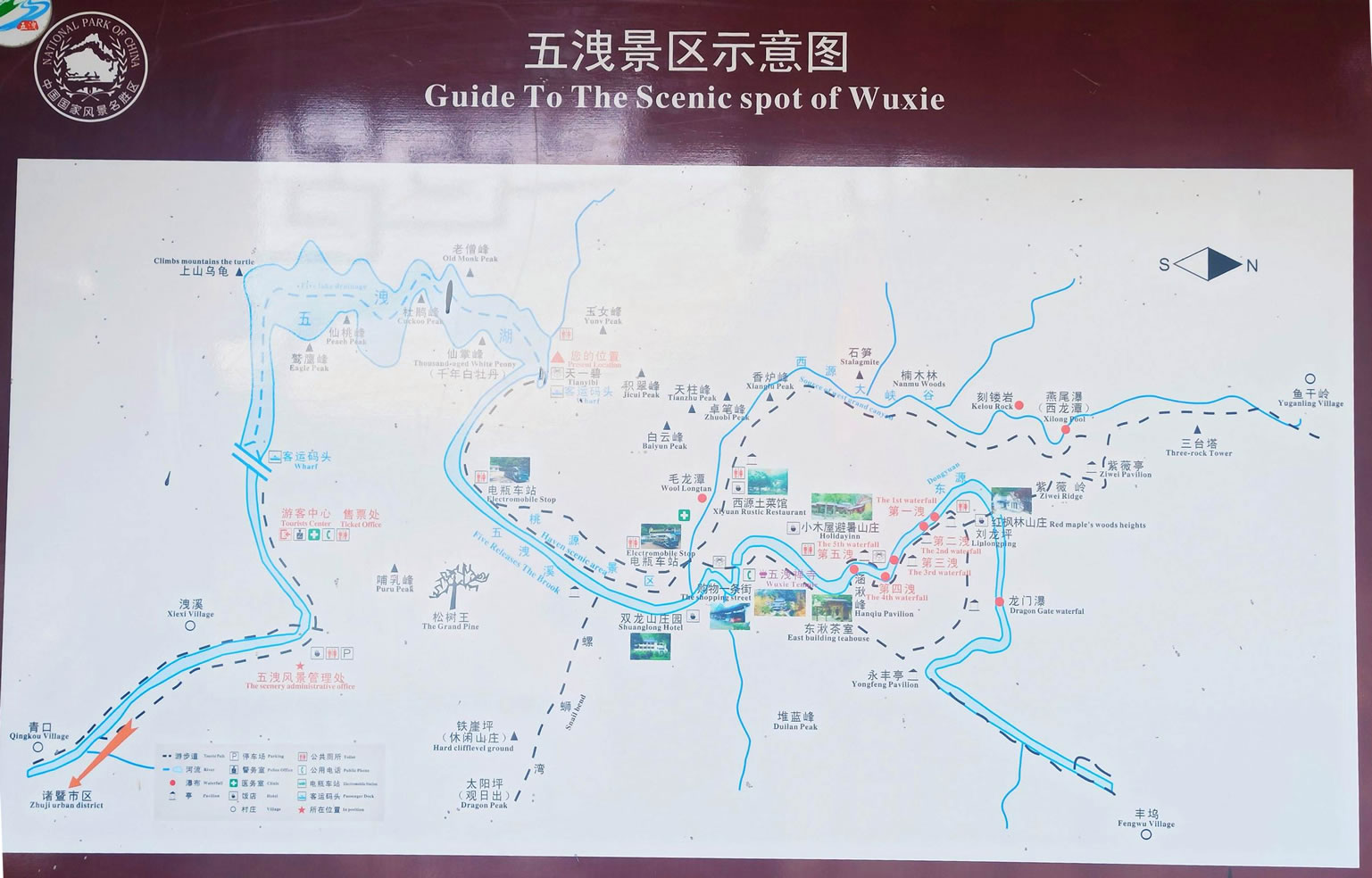 由紫藤長廊拾階登上壩頂,眼前展現(xiàn)的是一湖靜水,綠水蕩漾,深不可測。 水面上疾駛的游船,不時(shí)激起層層漣漪,把兩岸的元寶峰,鷲鷹峰,仙桃峰、杜鵑峰、老僧峰、仙掌峰等山峰的倒影彎折。 泛舟湖上,水鳥在水面低飛,狹長的湖面見不到盡頭,大有“青山綠水景無盡”之感,又有“一折青山一扇屏,一彎綠水一古琴”的詩意。沿湖兩邊,蔥蘢俊秀,美不勝收。春天萬木崢嶸,紅杜鵑從綠樹叢中透出;夏天滿山蔥郁,濃蔭蔽日;一到秋冬季節(jié),蒼黃的銀杏葉和紅艷的楓葉,點(diǎn)綴在一片蕭瑟之中。