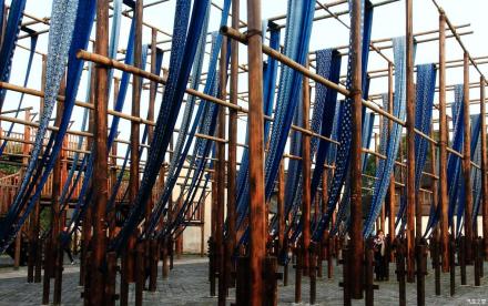 草本染色作坊是手工環(huán)保印染晾曬大型工坊。曬布場(chǎng)地以青磚鋪就,豎立著密密麻麻的高桿和階梯式曬布架,規(guī)模相當(dāng)龐大。草木本色染坊除了以藍(lán)草為原料漿染制作藍(lán)印花布工藝外,還有獨(dú)特的彩烤工藝流程。彩烤色彩豐富,是從當(dāng)?shù)氐牟菽驹现刑崛〉,像茶葉、桑樹(shù)皮、烏桕樹(shù)葉都是提取色彩的原料,所以這個(gè)染坊在當(dāng)?shù)亟凶霾菽颈旧痉弧?